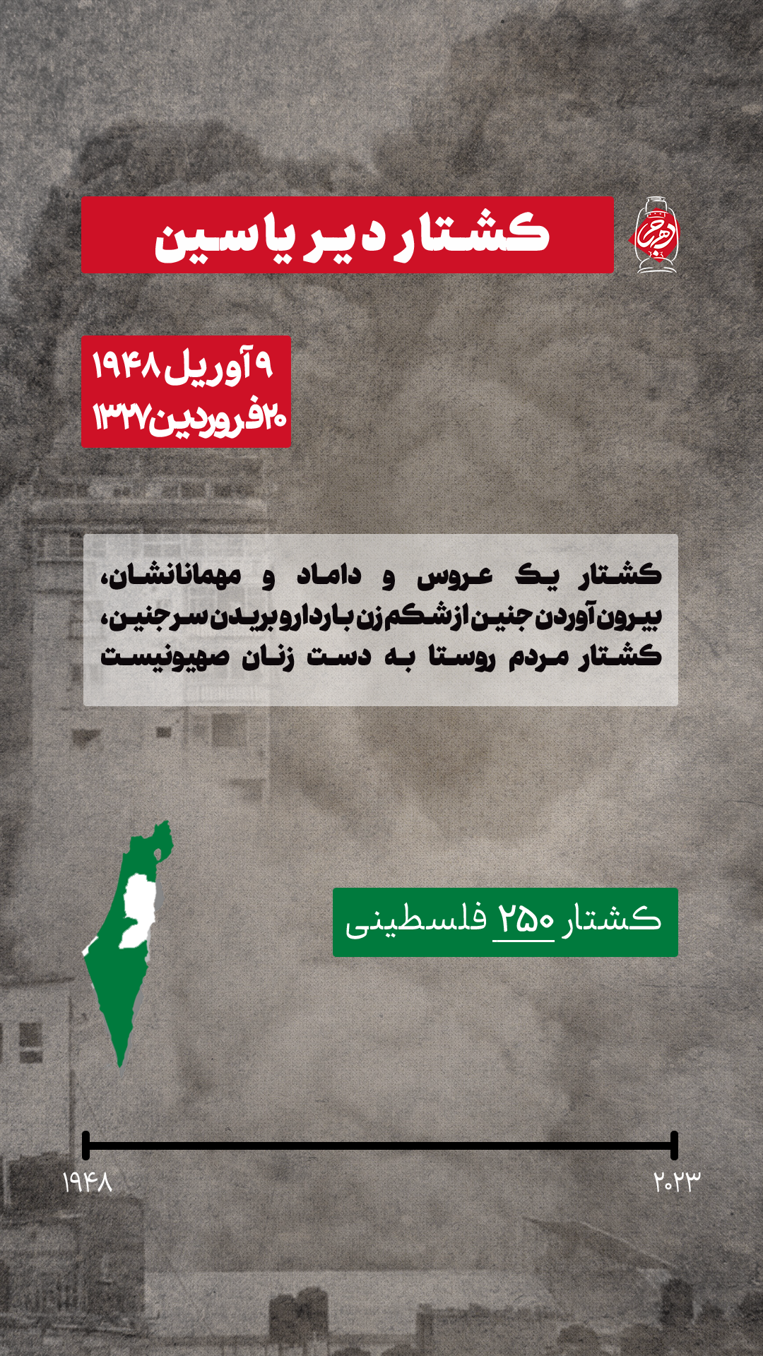 کشتار دیر یاسین در 9 آوریل 1948 (20 فروردین 1327) توسط رژیم صهیونیستی انجام شد و در نتیجه آن، 250 فلسطینی به شهادت رسیدند. کشتار یک عروس و داماد و مهمانانشان، بیرون آوردن جنین از شکم زن باردار و بریدن سر جنین، کشتار مردم یک روستا به زنان صهیونیست، گوشه از جنایات آنهاست.